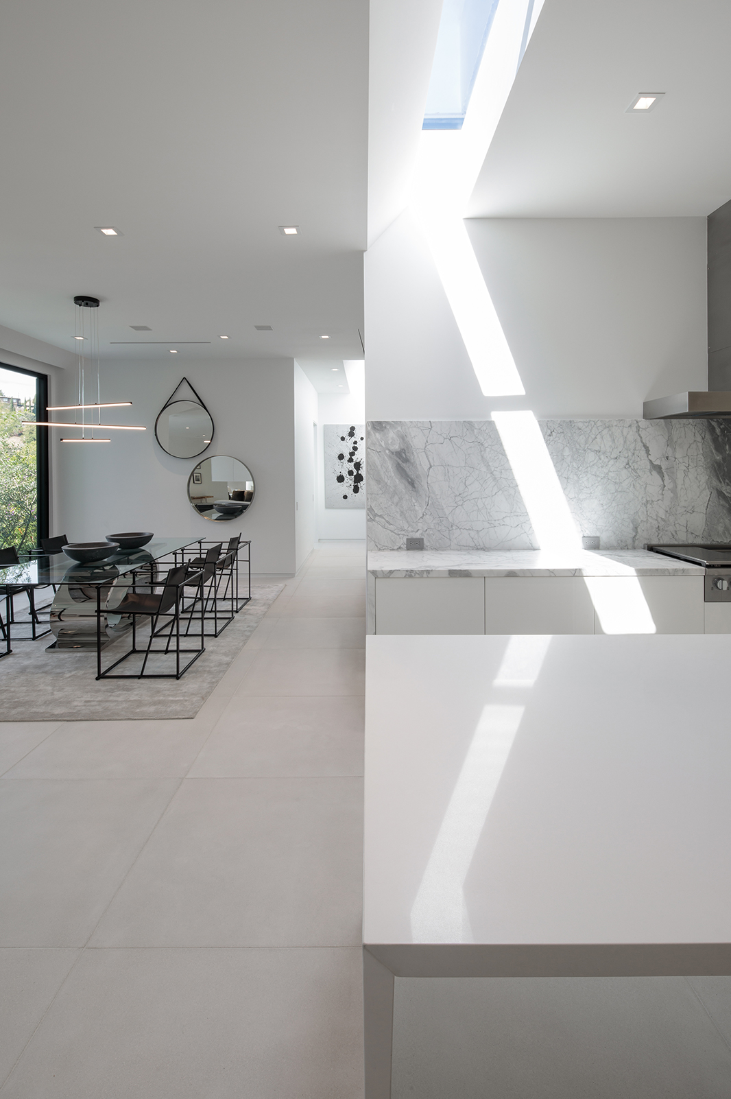 With each step the angular subtractions in the form manipulate transparency. This repetition continues into the residence and is then transitioned into voids in the roof between rooms, subtly separating the spaces and allowing for penetrating light.